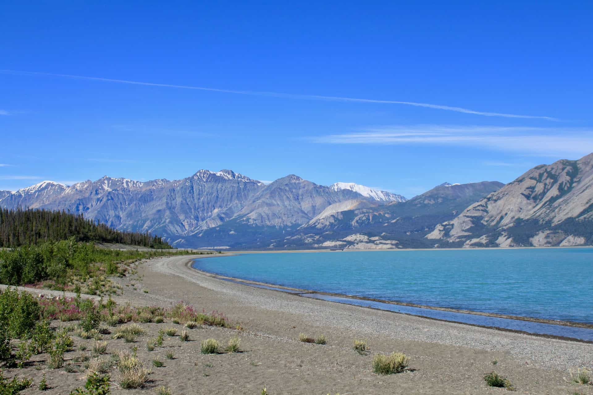 If you’re willing to drive a little farther, gorgeous Kluane Lake is about forty-five minutes beyond Haines Junction. There’s a wide beach perfect for skipping rocks – we actually used to call the place “Skipping Rock” – and the excellent Thachäl Dhäl Visitor Centre is just a little further around the bend. There, you’ll find lots of information about the history and geography of the area, and Dall sheep are known to frequent the surrounding mountains. You can also hike the short (1 km) Soldiers Summit Trail to the site where the Alaska Highway was officially opened in 1942.