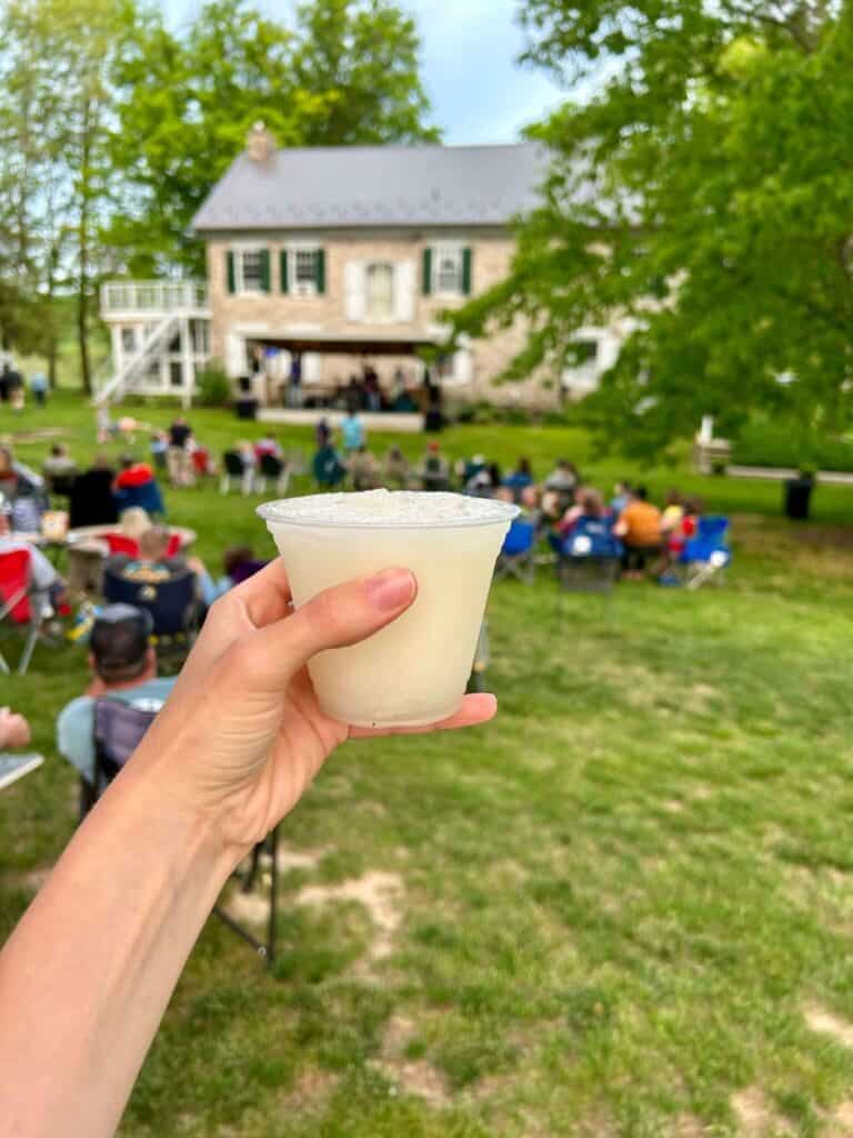 Friday Night Music takes place in the space between the Wilson House (home of the bed and breakfast as well as the tasting room) and Aisling Hall (one of the winery’s two beautiful event venues). A covered stage faces a semi-shaded lawn, where for a $5 cover* you can spend a couple of hours enjoying a local band, a food truck or two, and any of the Juniata Valley wines, wine slushies, and even a few different beers. (Food and drinks are at an additional but very reasonable cost.)